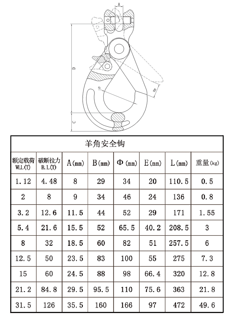 羊角安全鉤技術參數: ITEM NO. WLL/T B.L/T A B C D 8-SL1002-06 1.12 4.48 8 29 34 20 95.5 8-SL1002-7/8 2 8 9 34 46 24 121 8-SL1002-10 3.15 12.6 11.5 44 52 29 146 8-SL1002-13 5.4 21.6 15.5 52 65.5 40.2 182 8-SL1002-16 8 32 18.5 60 82